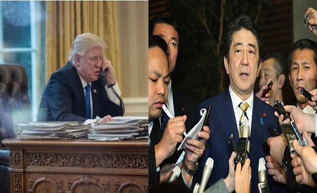 ทำเนียบขาวแถลงว่า ผู้นำทั้งสองได้โทรศัพท์สนทนากันเมื่อวันพุธตามเวลาสหรัฐ หลังจากเกาหลีเหนือยิงขีปนาวุธนำวิถีลงทะเลญี่ปุ่นเมื่อเช้าวันเดียวกันตามเวลาเกาหลีเหนือ ประธานาธิบดีทรัมป์กล่าวชัดเจนว่าสหรัฐจะเดินหน้าสร้างเสริมศักยภาพในการป้องกันและปกป้องสหรัฐและพันธมิตรอย่างเต็มความสามารถ และย้ำว่าสหรัฐจะเคียงข้างญี่ปุ่นและเกาหลีใต้เผชิญหน้ากับภัยคุกคามร้ายแรงจากเกาหลีเหนือ ทรัมป์เคยรับปากลักษณะเดียวกันนี้เมื่อครั้งต้อนรับอาเบะที่คฤหาสน์มาร์อะลาโกในรัฐฟลอริดาเมื่อเดือนกุมภาพันธ์