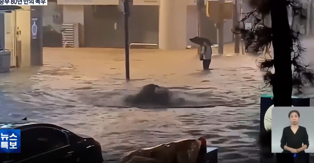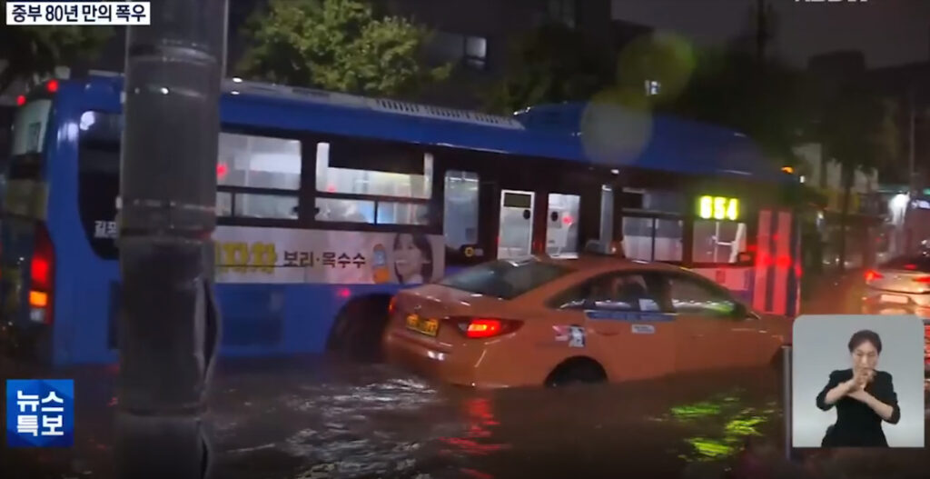 ขณะที่ชาวเน็ตในเกาหลีใต้ต่างแชร์ภาพน้ำท่วมสูงตามท้องถนนในกรุงโซลซึ่งทำให้รถติดยาวเหยียด และน้ำท่วมในสถานีรถไฟใต้ดิน รวมถึงน้ำยังไหลทะลักเข้าท่วมบ้านเรือนและธุรกิจห้างร้านจำนวนมาก