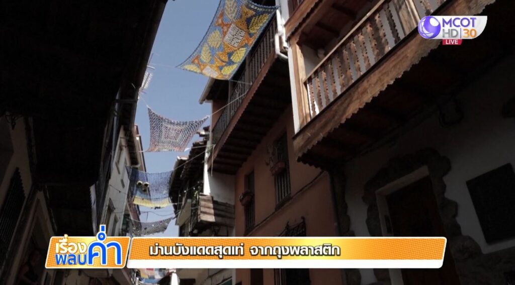 ม่านบังแดดลวดลายสวยงามและหลากสีสันที่ขึงอยู่บนท้องถนนในหมู่บ้านวัลเวอเด เดอลา เวราของสเปนถูกถักทอขึ้นจากถุงพลาสติกใส่ของหรือถุงก๊อปแก๊ปที่เราคุ้นเคยกันดี โดยตลอดเส้นทางยาวประมาณ 150 กิโลเมตร ในหมู่บ้านทางตะวันตกของกรุงมาดริดชาวเมืองซึ่งส่วนใหญ่เป็นผู้สูงอายุได้รวมกลุ่มกันเพื่อทำม่านบังแดดช่วยกันถักไว้จำนวนมากในช่วงฤดูหนาวและนำออกมาขึงบังแดดในฤดูร้อน โดยหวังว่าจะช่วยอนุรักษ์สิ่งแวดล้อมรวมทั้งดึงดูดนักท่องเที่ยวให้เข้ามาเยี่ยมชม คุณมารินา เฟอร์นันเดซ สถาปนิกและนักออกแบบซึ่งเป็นผู้ริเริ่มโครงการนี้บอกว่าการทำม่านบังแดดนอกจากจะช่วยอนุรักษ์งานศิลปะดั้งเดิมของชาวเมืองไว้ไม่ให้สูญหายแล้วยังช่วยให้ผู้สูงอายุมีพื้นที่ทางสังคมในการทำกิจกรรมร่วมกันอีกด้วย