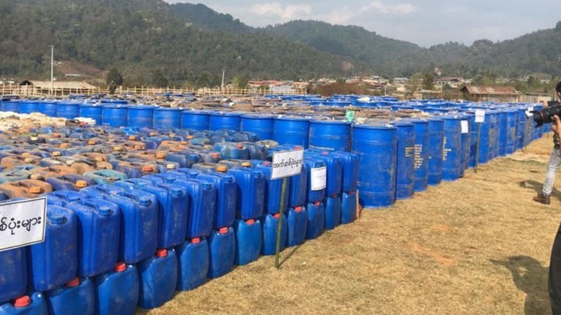 รอยเตอร์รายงานว่า ตำรวจปราบปรามยาเสพติดเมียนมายึดเมทิลเฟนทานิลได้กว่า 3,700 ลิตรใกล้หมู่บ้านแห่งหนึ่งในรัฐฉาน ทางตะวันออกเฉียงเหนือของประเทศ เป็นสัญญาณว่าแก๊งค้ายาเสพติดในเอเชียเริ่มเปลี่ยนไปค้ายาเสพติดในกลุ่มโอปิออยด์ที่มีมูลค่าสูง สำนักงานยาเสพติดและอาชญากรรมแห่งสหประชาชาติเผยว่า ทหารและตำรวจเมียนมาใช้เวลาปฏิบัติการนานสองเดือนจนสามารถทลายและยึดยาเสพติดจำนวนมาก โดยยึดได้พร้อมกับอุปกรณ์ผลิต อาวุธ สารตั้งต้น และยาเสพติดอื่น ๆ อีกจำนวนมาก เช่น ยาบ้า 17.5 ตันรวม 193 ล้านเม็ด หรือเกือบเท่าที่ยึดได้ในเมียนมาช่วงสองปีที่ผ่านมา และจับกุมผู้กระทำผิดได้กว่า 130 คน ผลการสอบปากคำพบว่า ยาเสพติดส่วนใหญ่กระจายอยู่ในเมียนมาและประเทศเพื่อนบ้าน