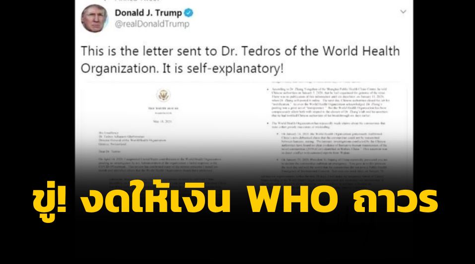 ประธานาธิบดีทรัมป์ทวีตเมื่อวันจันทร์ตามเวลาสหรัฐ เป็นภาพจดหมายที่เขาส่งถึง ดร.ทีโดรส อัดฮานอม กีบรีเยซุส ผู้อำนวยการองค์การอนามัยโลก และบรรยายว่าภาพอธิบายทุกอย่างหมดแล้ว จดหมายดังกล่าวทรัมป์ได้แจกแจงสิ่งที่เขาระบุว่า เป็นตัวอย่างความบกพร่องขององค์การอนามัยโลกในการจัดการกับโรคติดเชื้อไวรัสโคโรนา 2019 หรือโควิด-19 แพร่ระบาด เช่น การไม่รีบแจ้งเรื่องไวรัสโคโรนาแต่เนิ่น ๆ การสนิมสนมกับจีนมากเกินไป เห็นได้ชัดว่าการที่นายกีบรีเยซุสและองค์การอนามัยโลกทำผิดซ้ำแล้วซ้ำเล่าสร้างความเสียหายให้แก่โลกอย่างมหาศาล ทางเดียวที่องค์การอนามัยโลกจะทำได้คือ แสดงให้เห็นอย่างชัดเจนว่าเป็นอิสระจากจีน หากองค์การอนามัยโลกไม่มีการปรับปรุงอย่างเป็นรูปธรรมภายใน 30 วัน เขาจะทำให้การระงับจ่ายเงินสมทบชั่วคราวมาตั้งแต่กลางเดือนเมษายนกลายเป็นเรื่องถาวร และจะทบทวนเรื่องการเป็นสมาชิกองค์การอนามัยโลก