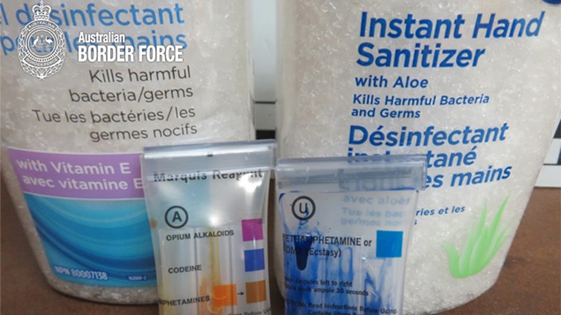 แถลงการณ์ของกองกำลังชายแดนออสเตรเลีย หรือเอบีเอฟระบุว่า จากการการตรวจสอบกล่อง 2 ใบ ที่ส่งจากแคนาดาไปยังนครซิดนีย์เมื่อต้นเดือนพฤษภาคม พบสารคล้ายผลึกที่มีผลทดสอบเป็นบวกต่อเมทแอมเฟตามีน หรือยาไอซ์ โดยภาพที่เผยแพร่โดยตำรวจได้แสดงให้เห็นขวดน้ำยาล้างมือ และขวดเจลทำความสะอาดมือ ที่เต็มไปด้วยยาเสพติดคล้ายผลึกคริสตัล