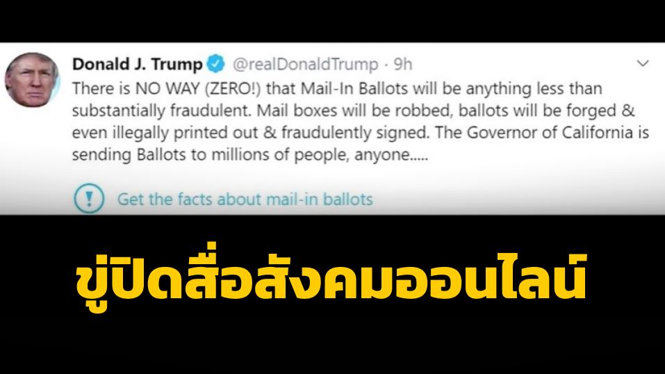 วอชิงตัน 28 พ.ค.- ประธานาธิบดีโดนัลด์ ทรัมป์ของสหรัฐ ขู่จะปิดสื่อสังคมออนไลน์ หลังจากทวีต 2 ข้อความของเขาถูกทวิตเตอร์ทำเครื่องหมายว่า ทำให้เข้าใจผิด เป็นปัญหาใหม่ของสื่อสังคมออนไลน์ที่พยายามจัดการกับการเผยแพร่ข้อมูลไม่ถูกต้องทางการเมืองช่วงหาเสียงเลือกตั้งประธานาธิบดีสหรัฐปีนี้
