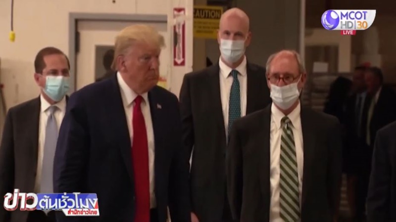 สหรัฐ 6 มิ.ย. – ประธานาธิบดีโดนัลด์ ทรัมป์ ของสหรัฐ ไม่ยอมสวมหน้ากากอนามัย ระหว่างเยี่ยมชมโรงงานผลิตชุดตรวจหาเชื้อโควิด-19 ที่เมืองกิลฟอร์ด