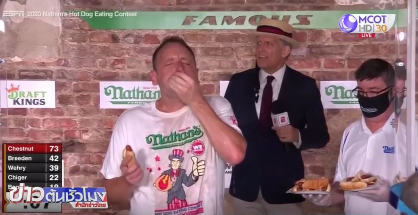สองแชมป์เก่าการแข่งขันกินฮอตดอกประจำปีฉลองวันชาติสหรัฐ 4 กรกฎาคม คว้าแชมป์ไปได้อีกครั้งในปีนี้ โดยมิกิ ซูโด แชมป์ฝ่ายหญิงที่ครองแชมป์มาแล้วถึง 6 สมัย ป้องกันแชมป์เป็นครั้งที่ 7 ไว้ได้ ด้วยการกินฮอตดอก 48 ชิ้นครึ่ง จนหมดในเวลาเพียง 10 นาที ขณะที่แชมป์ฝ่ายชายอย่างโจอี้ เชสต์นัท ซึ่งสามารถคว้าแชมป์ได้ถึง 12 ครั้งจากการแข่งขันตลอด 13 ปีที่ผ่านมา ก็กินฮอตดอกได้มากเป็นสถิติใหม่ ถึง 75 ชิ้นในเวลา 10 นาที เอาชนะคู่แข่งคนอื่นๆ ได้แบบขาดลอย การแข่งขันกินฮอตดอกฉลองวันชาติปีนี้ แตกต่างไปจากทุกปี เพราะจัดแบบไม่มีผู้ชมเข้าชม เนื่องจากสถานการณ์การแพร่ระบาดของโรคโควิด-19.-สำนักข่าวไทย