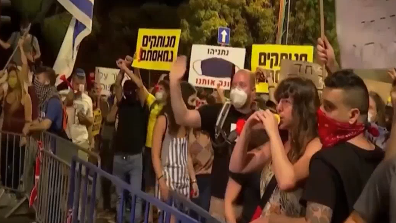 อิสราเอล 19 ก.ค. – ตำรวจอิสราเอลเข้าสลายฝูงชนที่มาชุมนุมประท้วงหน้าบ้านพักนายกรัฐมนตรี ในนครเยรูซาเลม หลังไม่พอใจการรับมือกับการแพร่ระบาดโควิด-19 ของรัฐบาล