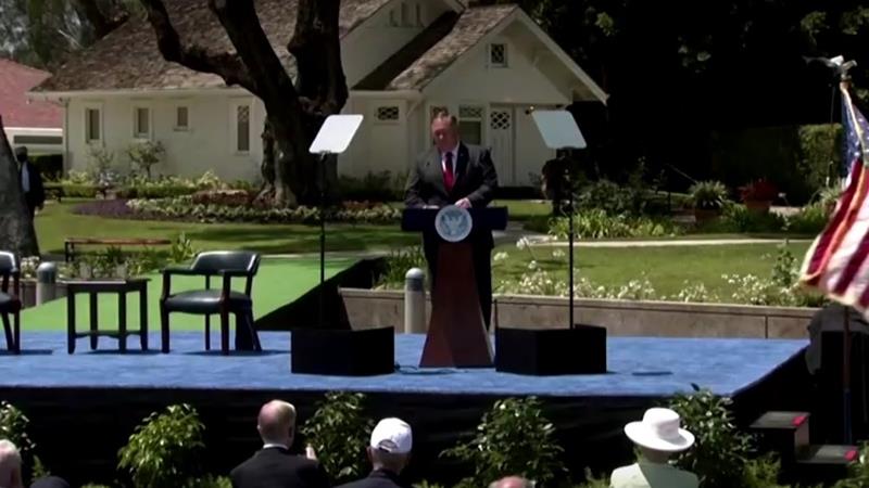 นายพอมเพโอกล่าวสุนทรพจน์เรื่องจีนคอมมิวนิสต์และอนาคตโลกเสรีที่ห้องสมุดประธานาธิบดีริชาร์ด นิกสัน เมืองยอร์บาลินดา รัฐแคลิฟอร์เนีย วิจารณ์จีนเป็นครั้งที่สี่ในรอบหนึ่งเดือนด้วยการเสนอให้ชาวจีน 1,400 ล้านคนที่ถูกจับตา กดขี่ และกลัวที่จะพูด รวมทั้งประเทศในเอเชีย-แปซิฟิกอย่างเวียดนามและออสเตรเลีย สร้างพันธมิตรประชาธิปไตยต่อต้านรูปแบบการครอบงำของพรรคคอมมิวนิสต์จีน นายพอมเพโอกล่าวว่า การรวมพลังทางเศรษฐกิจ การทูตและการทหารของสหประชาชาติ องค์การสนธิสัญญาแอตแลนติกเหนือ กลุ่มประเทศอุตสาหกรรมชั้นนำ 7 ประเทศ กลุ่มประเทศเศรษฐกิจขนาดใหญ่ สามารถรับมือความท้าทายจากจีนได้หากจัดการอย่างเหมาะสม อาจถึงเวลาแล้วที่ต้องตั้งกลุ่มใหม่ของประเทศที่มีความคิดเดียวกัน และไม่สามารถใช้แต่วิธีแข็งกร้าว ต้องให้ชาวจีนผู้รักเสรีภาพที่แยกตัวออกจากพรรคคอมมิวนิสต์อย่างเด็ดขาดอยู่แล้วเข้ามามีส่วนร่วมและมีอำนาจมากขึ้น