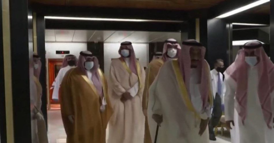 มกุฎราชกุมารโมฮัมเหม็ด บิน ซัลมาน เสด็จมารับพระราชบิดาออกจากโรงพยาบาล โดยทรงสวมหน้ากากอนามัย ทั้งนี้ ก่อนเข้ารับการผ่าตัด สมเด็จพระราชาธิบดีซัลมานทรงเป็นประธานการประชุมผ่านทางวิดีโอเมื่อสัปดาห์ที่แล้ว.-สำนักข่าวไทย
