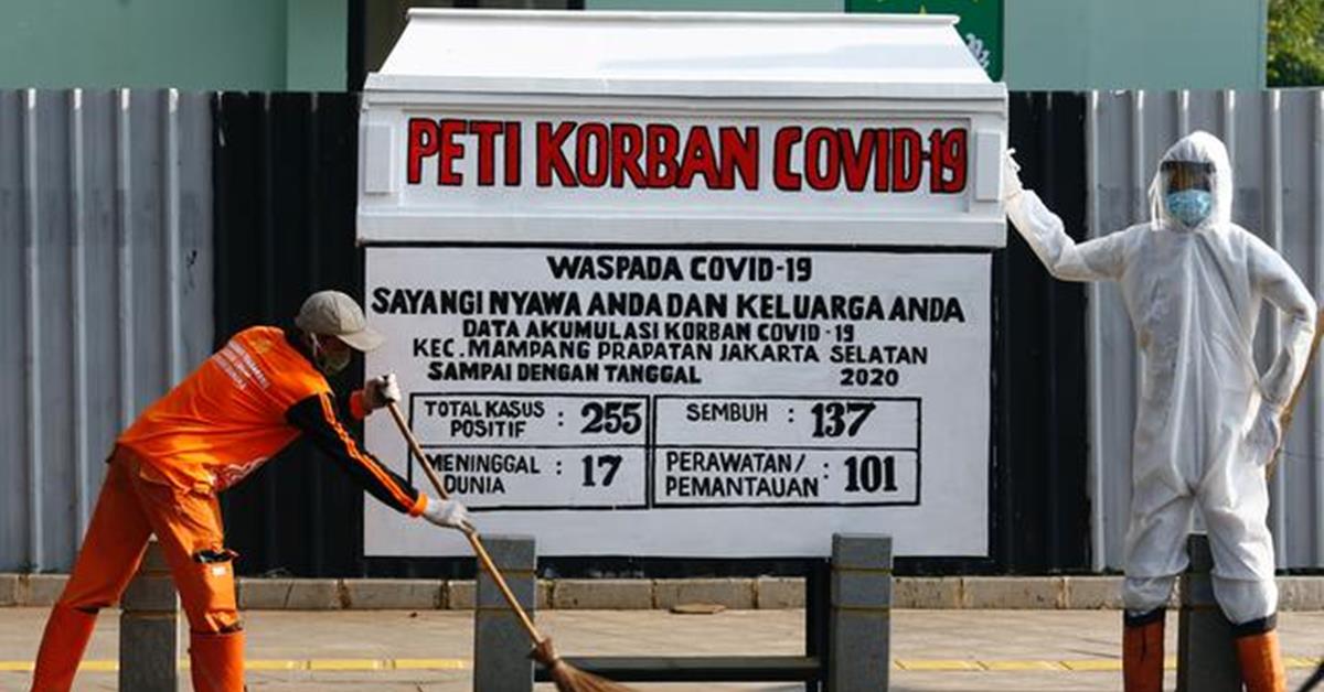 โลงศพเปล่ามีตัวอักษรสีแดงคำว่า เหยื่อโควิด-19 ตั้งอยู่ในเขตหนึ่งของกรุงจาการ์ตา ศูนย์กลางการระบาดของประเทศ ข้างโลงมีหุ่นสวมหน้ากากอนามัย เฟซชิลด์หรือแผ่นกระบังป้องกันใบหน้า และชุดอุปกรณ์ป้องกัน ด้านล่างมีกระดานแจ้งยอดผู้ป่วยและเสียชีวิตล่าสุดของเขตนั้น เจ้าหน้าที่ยอมรับว่า วิธีนี้อาจสุดโต่งไปหน่อย แต่หวังว่าจะทำให้ประชาชนตระหนักได้ ยอดผู้ติดเชื้อเพิ่มขึ้นทุกวัน แต่ประชาชนยังคงเพิกเฉยต่อแนวทางด้านสุขภาพ การตั้งโลงศพกลางสี่แยกจะช่วยเตือนสติเรื่องสถานการณ์การระบาดเพื่อให้ประชาชนปรับเปลี่ยนพฤติกรรม