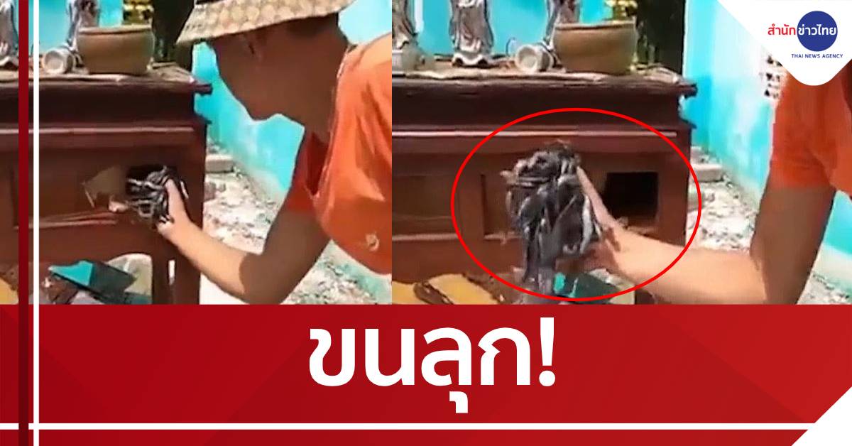 คลิปชวนขนลุกนี้ถูกโพสต์โดยเฟซบุ๊ก -Alex Law เมื่อวันเสาร์ที่ 15 ส.ค.ที่ผ่านมา เขาและเพื่อนๆ พยายามจัดการกับบรรดาครอบครัวงู ที่อาศัยอยู่ในโต๊ะหมู่บูชาทั้งตัวเล็กตัวใหญ่ แม้แต่ในแจกันก็มี
