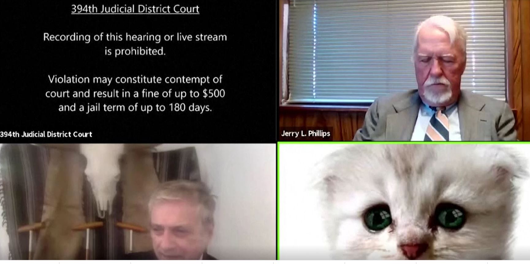 ผู้พิพากษาเรย์ เฟอร์กูสัน ที่เข้าร่วมการพิจารณาคดีออนไลน์ของศาลแขวงเขตที่ 394 ในรัฐเทกซัส โดยใช้โปรแกรม Zoom เมื่อไม่กี่วันก่อน ต้องแปลกใจ เมื่อพบว่าหน้าจอของร็อด พอนตัน อัยการที่เข้าร่วมพิจารณาคดีทางออนไลน์ครั้งนี้กลายเป็นใบหน้าแมว เนื่องจากพอนตันเผลอไปกดเลือกฟิลเตอร์ ใบหน้ารูปน้องแมวบนโปรแกรม Zoom ตั้งแต่เริ่มสนทนา และไม่รู้วิธีปิดฟิลเตอร์ จากคลิปจะได้ยินเสียงผู้เข้าร่วมการพิจารณาคดีออนไลน์ถามพอนตันว่านั่นใช่เขาหรือเปล่า และเขารู้ตัวหรือไม่ที่ใช้ฟิลเตอร์รูปใบหน้าแมว ขณะที่พอนตันถามว่าทุกคนได้ยินเสียงของเขาหรือไม่ และว่าเขาร่วมประชุมอยู่ด้วย แต่ไม่รู้วิธีกดฟิลเตอร์ออก ขอพูดคุยกันแบบนี้เลยตามเลยแล้วกัน