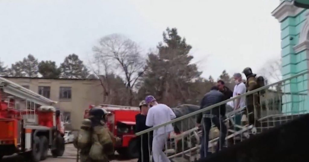 ไฟไหม้หลังคาโรงพยาบาลอามูร์ สเตท เมดิคอล อะคาเดมี เมืองบลาโกเวชเชงส์ค ของรัสเซีย เมื่อวันที่ 2 เม.ย.ที่ผ่านมา แต่ทีมแพทย์ที่เพิ่งเริ่มผ่าตัดหัวใจให้คนไข้ก่อนหน้าไฟไหม้ ต้องดำเนินการต่อจนเสร็จและรีบนำส่งไปพักฟื้นอาการต่อที่โรงพยาบาลอื่น