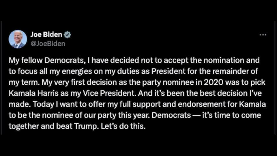 แหล่งข่าวเผยว่า สาเหตุที่ไบเดนตัดสินใจถอนตัวอย่างกะทันหัน เป็นเพราะได้วิเคราะห์ข้อมูลจากคนสนิทระหว่างกักตัวเมื่อวันเสาร์ว่า มีคะแนนตามหลังทรัมป์ในรัฐสมรภูมิหรือสวิงสเตทสำคัญหลายรัฐ จึงได้ประกาศการตัดสินใจผ่านการเผยแพร่จดหมายถึงชาวอเมริกันทั้งประเทศ แต่จะยังคงดำรงตำแหน่งประธานาธิบดีไปจนครบวาระ ปิดฉากความหวังที่อาจจะได้เป็นประธานาธิบดีสหรัฐเป็นสมัยที่ 2