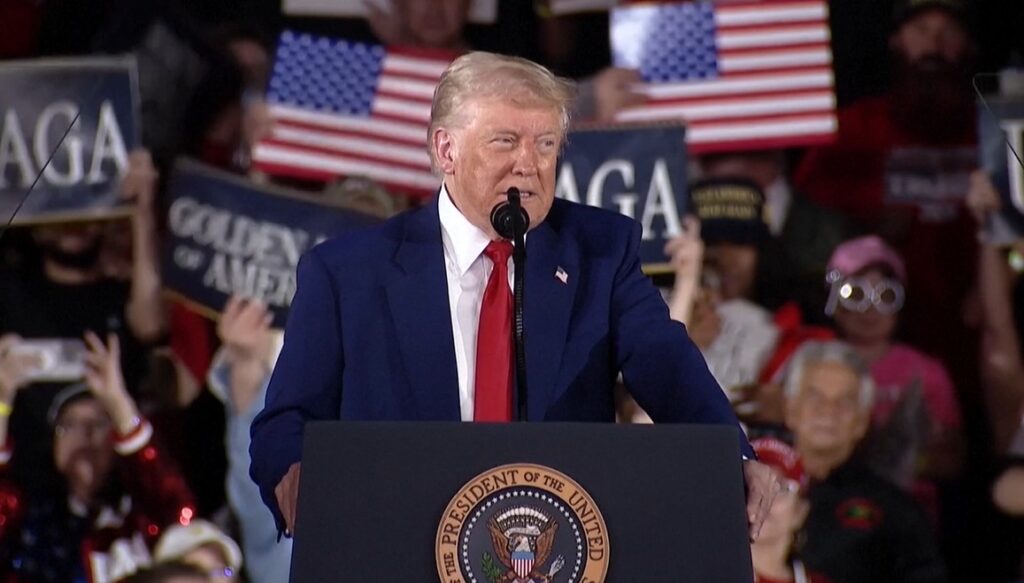 นายทรัมป์ เลือกแสดงผลงาน 100 วันแรก ในรูปแบบการปราศรัยกับฐานเสียงผู้นิยมชมชอบ เลือกรัฐมิชิแกน รัฐสมรภูมิที่เขาช่วงชิงมาได้ จนได้ครองทำเนียบขาว สุ้มเสียงถ้อยคำที่ใช้ยังเผ็ดร้อน เสมือนกับการหาเสียง นายทรัมป์ มุ่งโจมตีพรรคเดโมแครต พรรคการเมืองฝ่ายตรงข้าม ว่าเป็นฝ่ายซ้ายที่สกัดกั้นเขา
