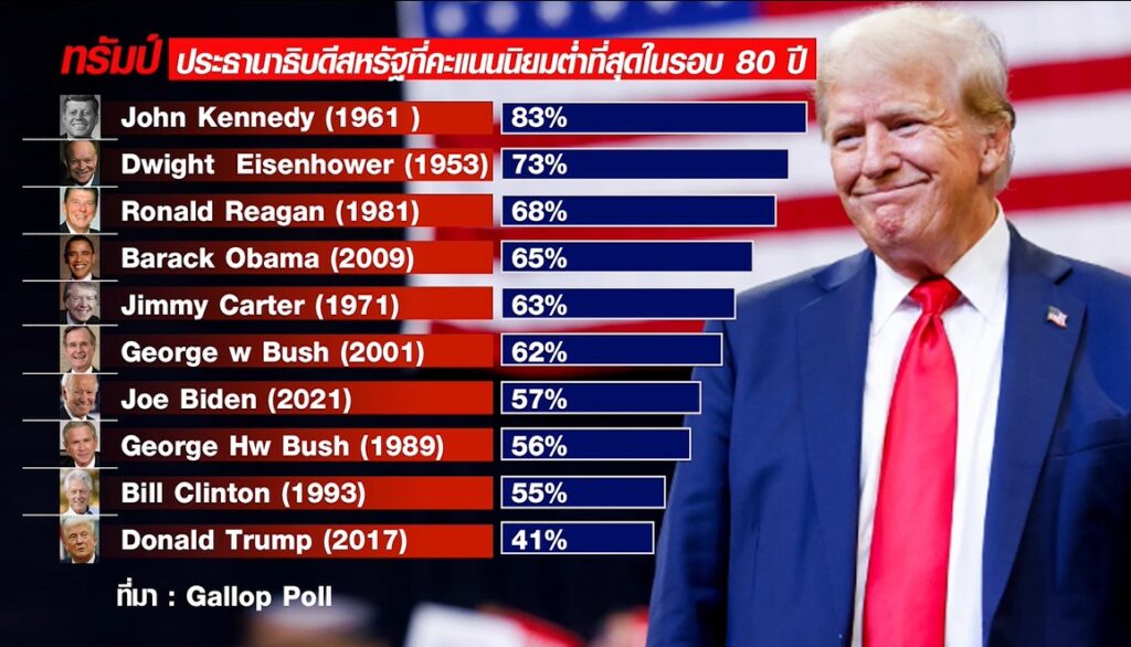 อย่างไรก็ตาม ในสายตาของทั่วโลกแล้วไม่ต้องมีการสำรวจใดๆ จะเห็นได้ว่าในตำแหน่งประธานาธิบดีสหรัฐสมัยที่ 2 ของนายทรัมป์ เป็นช่วงเวลาที่เลวร้าย ผลกระทบจากมาตรการภาษี ตัดลดความช่วยเหลือต่างประเทศ ถอนตัวจากความร่วมมือในองค์การระหว่างประเทศ ถอยห่างจากพันธมิตร แล้วยังมีแนวคิดก้าวร้าวด้วยการยึดคลองกรีนแลนด์ และคลองปานามา แม้แต่ประเทศเพื่อนบ้านอย่างแคนาดา ยังกดดันให้มาเป็นรัฐที่ 51 ของสหรัฐ นี่คือ 100 วันแรกของอเมริกาต้องมาก่อนของนายทรัมป์เท่านั้น ยังต้องคงมีอีกหลายร้อยวันตามมา.-สำนักข่าวไทย